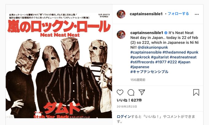 Captain Sensible It S Neat Neat Neat Day In Japan Today Is 22 Of Feb 2 So 222 Which In Japanese Is Ni Ni Ni キャプテンセンシブル ザダムド ダムド パンク 嵐のロックンロール ニニニの日